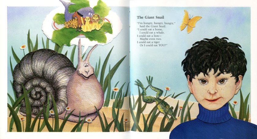 The poems in Don’t Eat Spiders irresistibly combine the lyrical with the ridiculous. Robert Heidbreder has a keen ear for the sound patterns and rhymes that delight children and a sure sense of the silly, or even scary, things that entertain them. Not only do Karen Patkau’s collage illustrations capture the playful spirit of the poems, but their tactile quality make her creatures leap off the page. The feathery feel or ‘a gigantic bird, a dinosaur in air.’